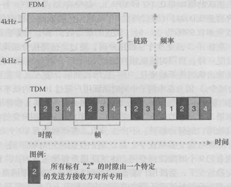复用. 有频分复用(Frequency-Division Multiplexing)和时分复用(Time-Division Multiplexing)两种, 对FDM, 链路的频谱被创建的所有连接共享, 频段的宽度叫带宽(bandwidth). 对TDM, 时间被划分为固定区间的帧, 帧也的被固定的时隙划分. 每个电路在周期性的时隙中可以得到所有带宽, 所以电路的传输速率等于帧速率乘以时隙中的比特数量.