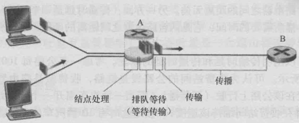 包括结点处理时延(nodal processing delay), 排队时延(queuing delay), 传输时延(transmission delay)和传播时延(propagation delay), 共同组成了节点总时延(total nodal delay).