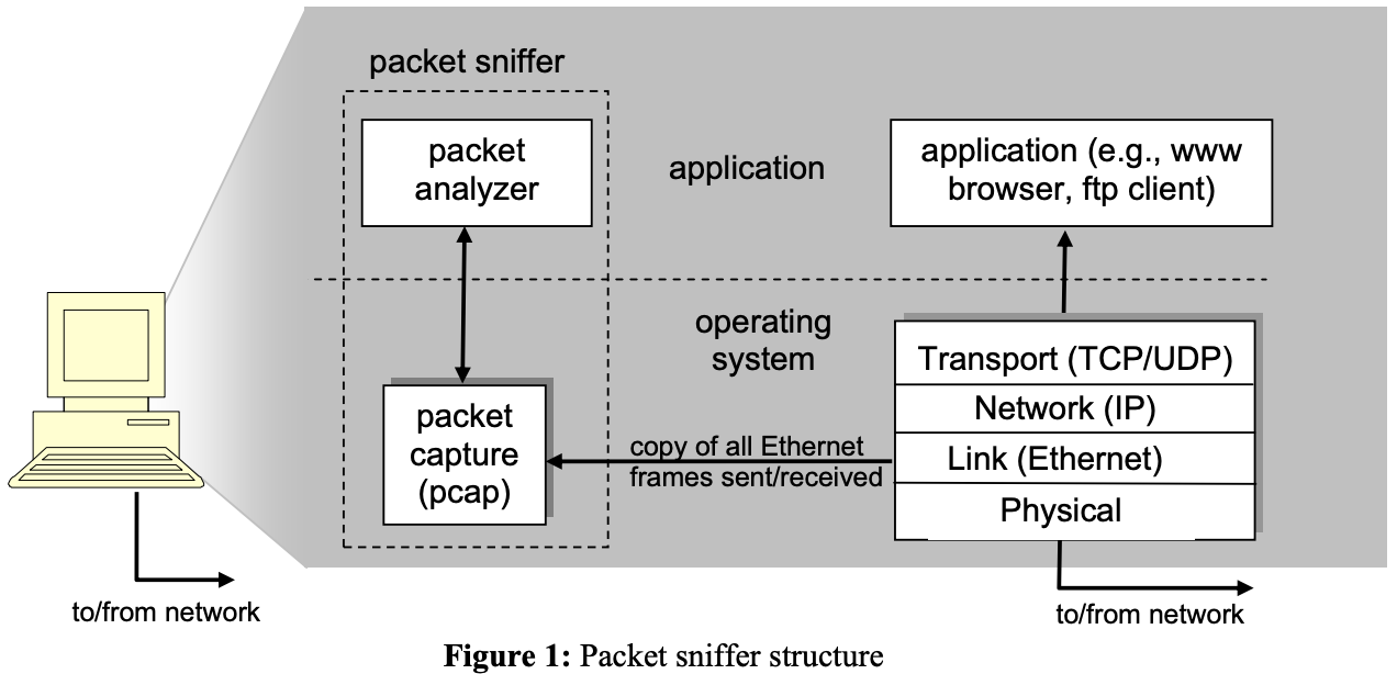 后面一系列的实验都会用wireshark抓包分析, 非常有趣. 我都基于第七版来做, 写这篇笔记的时候已经有第八版了. wireshark这种观察交换报文的工具也叫packet sniffer, 结构如下图. packet sniffer包含packet capture library去获取链路层的帧, packet analyzer根据不同的协议可以去解析帧, 把帧解析为ip数据报, 报文段等等.
