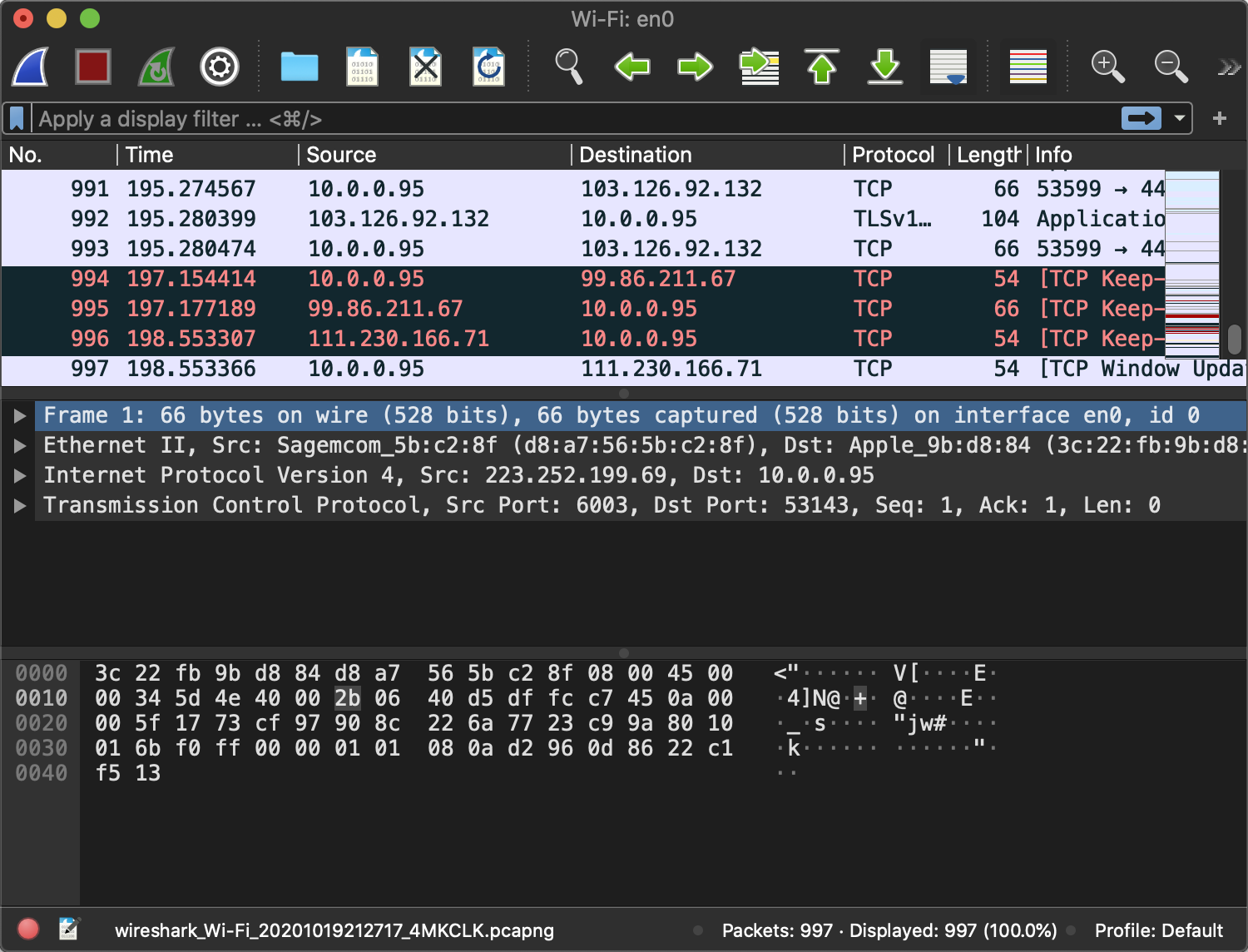 双击Wi-Fi en0就可以抓当前连接wifi的包了. 注意packet-listing window中的No.只是Wireshark标的号而已, 和头部字段没有关系.