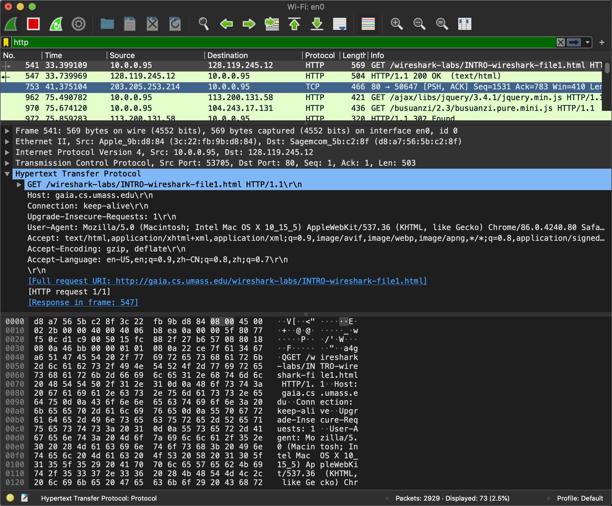 向http://gaia.cs.umass.edu/wireshark-labs/INTRO-wireshark-file1.html发送HTTP请求. 这里如果没有得到结果可能是浏览器已经缓存了, 清除缓存再试一次就好. 可以根据time计算从GET到OK的时间. 在菜单的View中可以修改时间的格式.