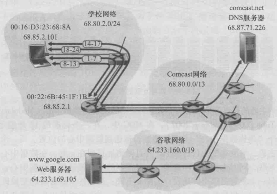 书本上用张三访问www.google.com为例, 过程如下图. 张三将笔记本通过以太网电缆连接到学校的以太网交换机, 而交换机连接着学校的路由器. 学校的路由器连接着ISPcomcast.