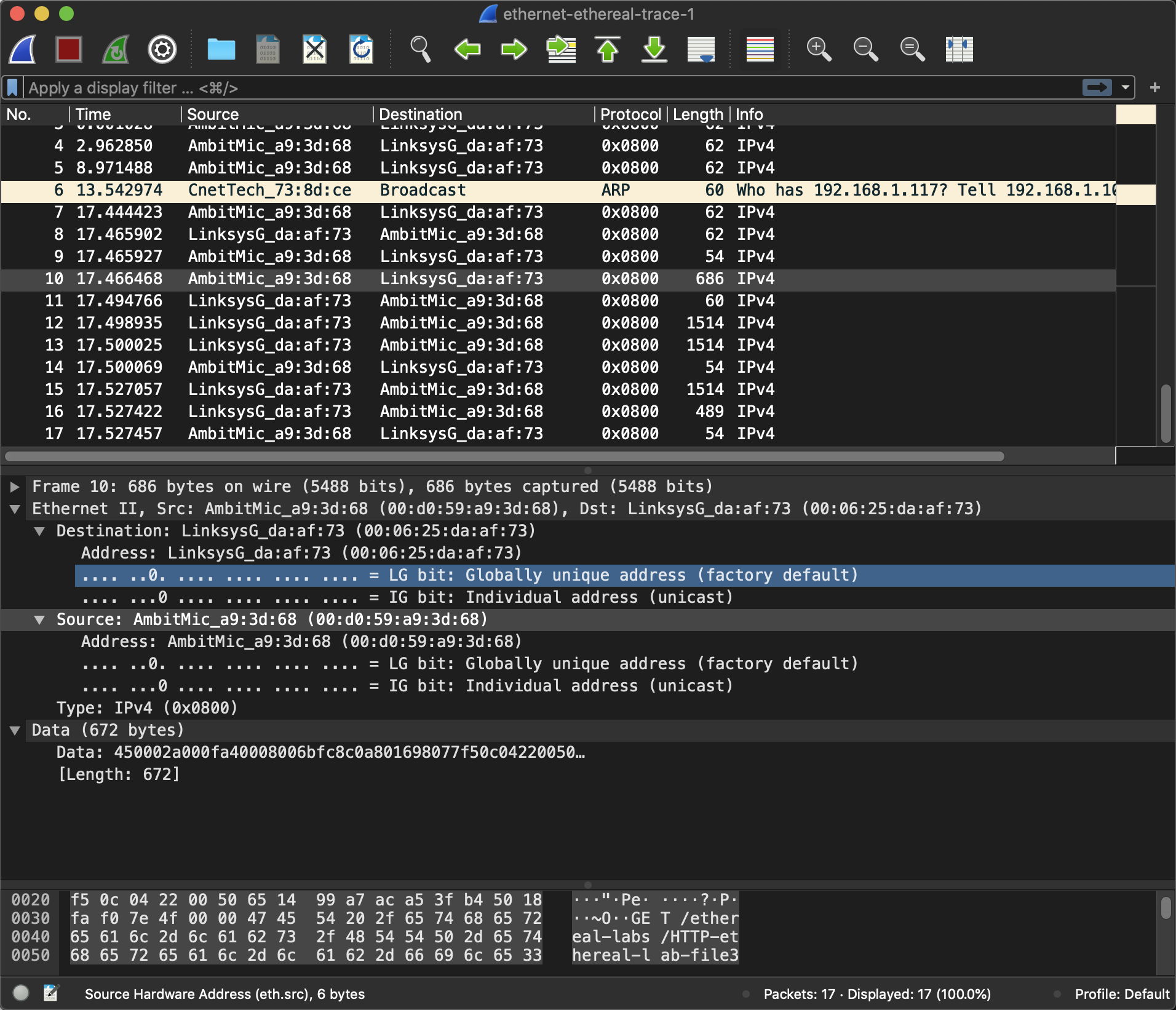 选择的这一条信息是包含HTTP GET的. host的MAC地址是00:d0:59:a9:3d:68, 目的地址是00:06:25:da:af:73. 而以太网类型编号0x0800表示IPv4. 到G出现在以太网帧共有55byte(两个16进制位相当于一个字节).