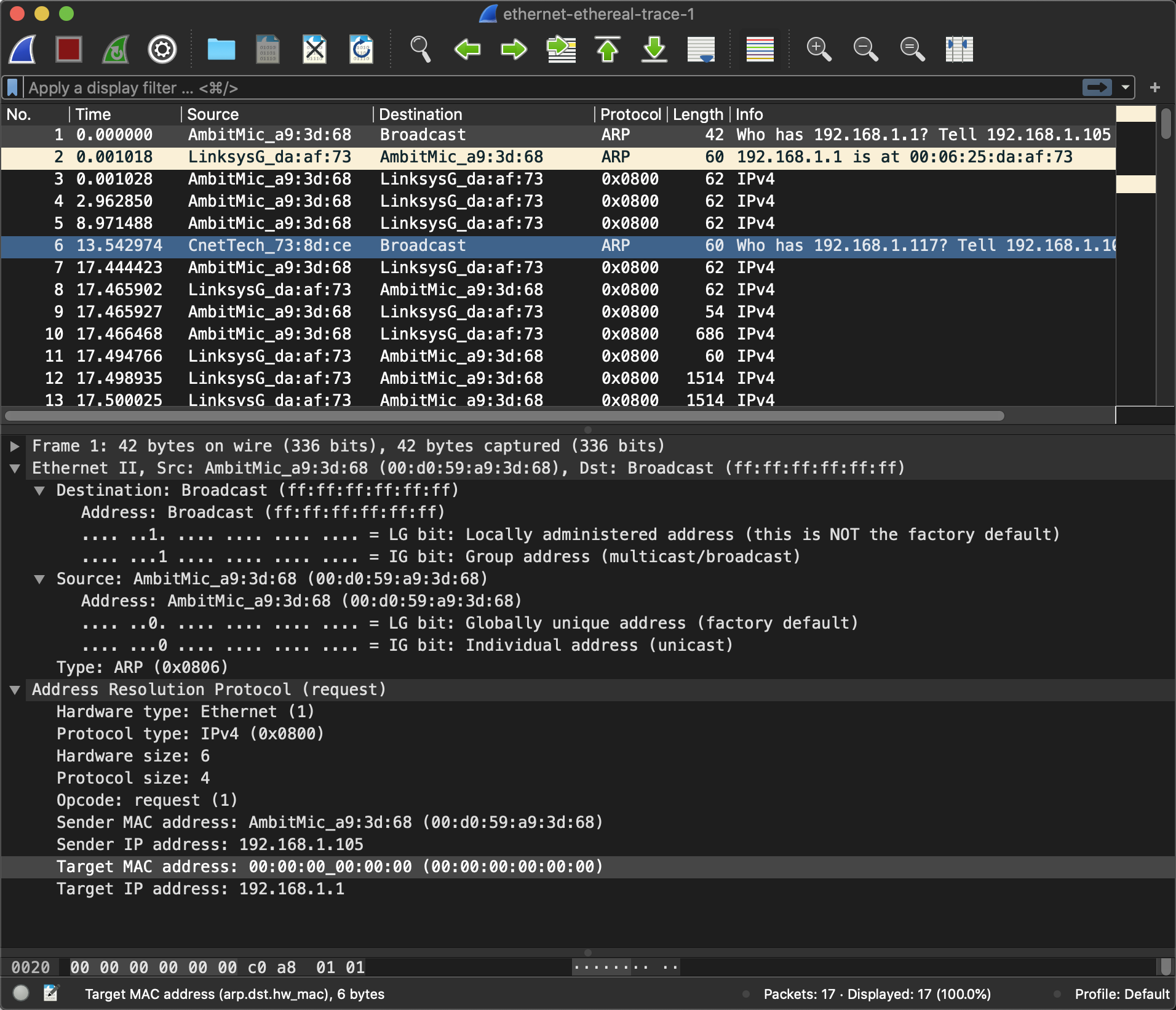 ARP响应. 此时路由器的MAC地址就知道了. 路由器的MAC地址是00:06:25:da:af:73, 而主机的MAC地址是00:d0:59:a9:3d:68.