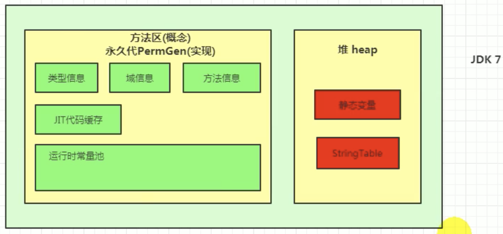 - jdk1.7: 有永久代, 但已经逐步去除永久代, 其中的字符串常量池/静态变量被转移到堆中.