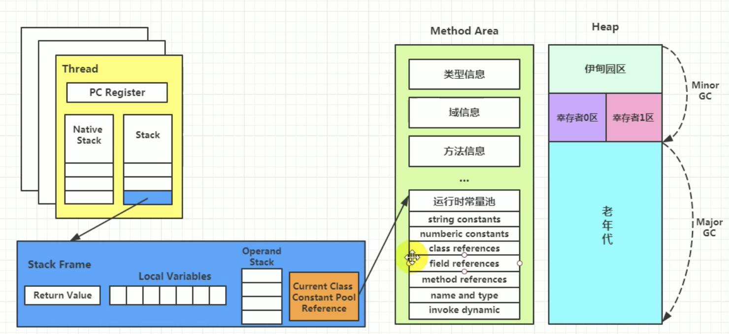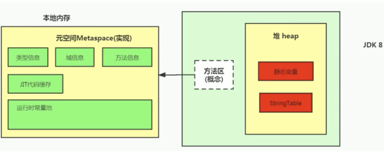- jdk1.8及之后: 无永久代, 类型信息, 字段, 方法, 常量保存在本地内存的元空间. 但字符串常量池, 静态变量仍在堆.