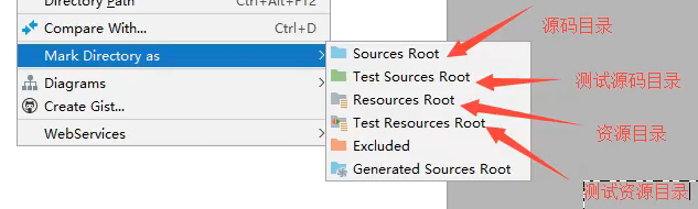 如果新建文件夹, 可以右键, 标记这个文件夹. 比如把main下的java和resource分别标记为源码和资源目录, 一般项目也都是这么做. 也可以在project structure的module中标记.