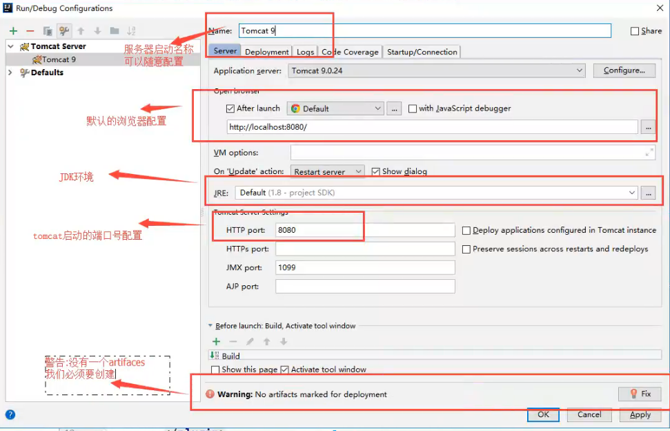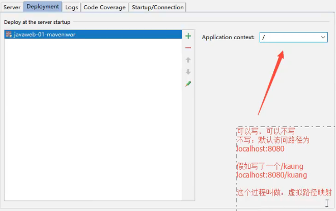 在Add Configuration中点加号, 选择Tomcat server-local. 如下配置Tomcat, 其中Application context就是默认生成的目录, 而warning就是因为一个网站要选定一个文件夹的名字.
